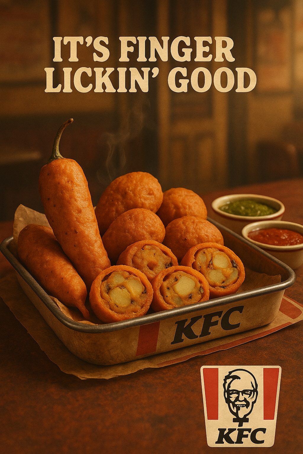 Subtle KFC cues — a hint of red-white tray pattern, retro enamel dipping bowls with mint and tomato chutneys — tie the brand identity into the local flavor palette. Film-grain texture, soft vignette edges, and analog color grading reinforce the 1970s aesthetic. Shot at 50mm f/2.2 with shallow depth, tack-sharp focus on the fritters, evoking warmth, nostalgia, and cultural fusion.McDonald's