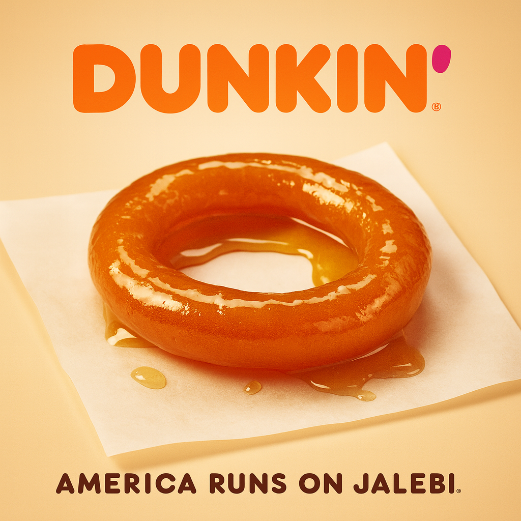 A stylized photorealistic parody advertisement of a single golden-orange jalebi presented like a Dunkin’ Donut. The jalebi is a single thick circular piece (not spiral), glossy and syrup-coated, placed neatly on white parchment with subtle syrup puddles around it. The surface gleams under professional studio lighting, capturing an indulgent “sugar-drip fantasy” look. The background is a soft pastel beige-to-warm-orange gradient, clean and modern, evoking a warm morning ad feel. The official Dunkin’ Donuts logo is prominently displayed across the upper portion of the composition, clearly visible and central to the parody. Below the jalebi, the tagline “America Runs on Jalebi” appears in bold Dunkin-style typography. Shot with commercial food-photography lighting, softbox glow, tack-sharp focus on the hero, crisp vignette edges, editorial-grade gloss finish, --ar 1:1.Taco Bell