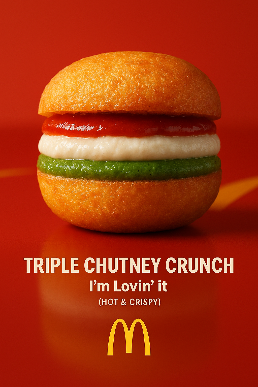 The background is minimal and glossy — a clean McDonald’s red surface with soft yellow highlights and faint reflections, referencing brand colors without any fries, packaging, or drink visuals. The lighting is bright, controlled, and commercial-grade, emphasizing the sheen, contrast, and appetizing surface details. The composition is centered and cinematic, using shallow depth of field to isolate the vada as the hero object. The authentic McDonald’s logo and tagline “Triple Chutney Crunch — I’m Lovin’ It (Hot & Crispy)” appear below in minimalist typography.