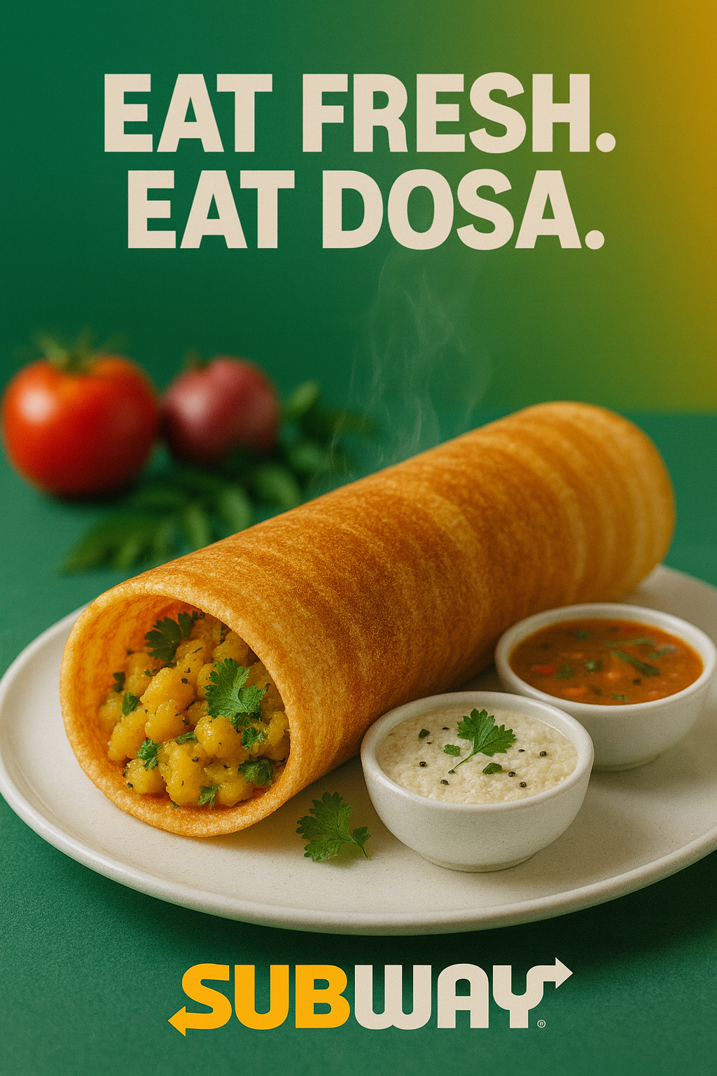 A photorealistic Indian fast-food advertisement inspired by Subway brand aesthetics, featuring a freshly made Masala Dosa styled like a Subway sandwich roll. The dosa is golden-brown, crisp, and slightly rolled open to reveal steaming spiced potato masala, fresh coriander, and a side of coconut chutney and sambar. Background uses the classic Subway-inspired green and yellow color palette with clean gradients and subtle brand-style typography reading “Eat Fresh, Eat Dosa.”