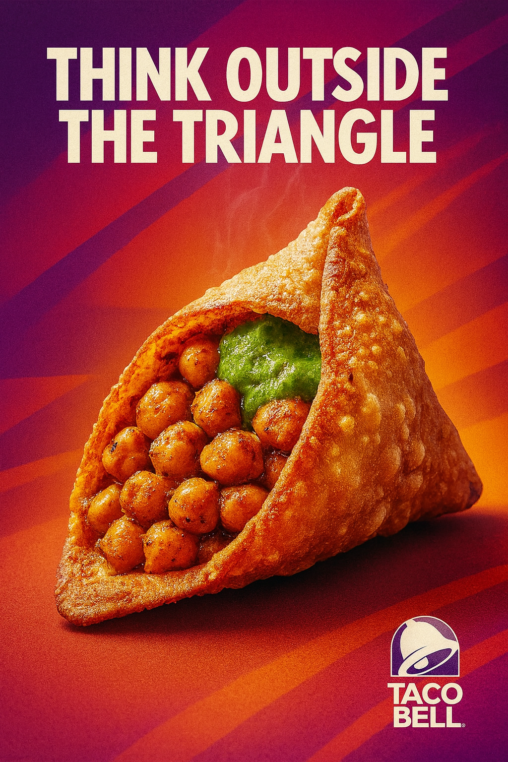 Set against a bold Taco Bell-inspired purple-and-orange gradient background with abstract geometric shapes and faint motion streaks. The tagline “Think Outside the Triangle” appears in playful, contemporary Taco Bell typography. Lighting is vivid and contrast-rich, emphasizing texture and sheen — warm highlights on the samosa surface, soft shadows for depth.